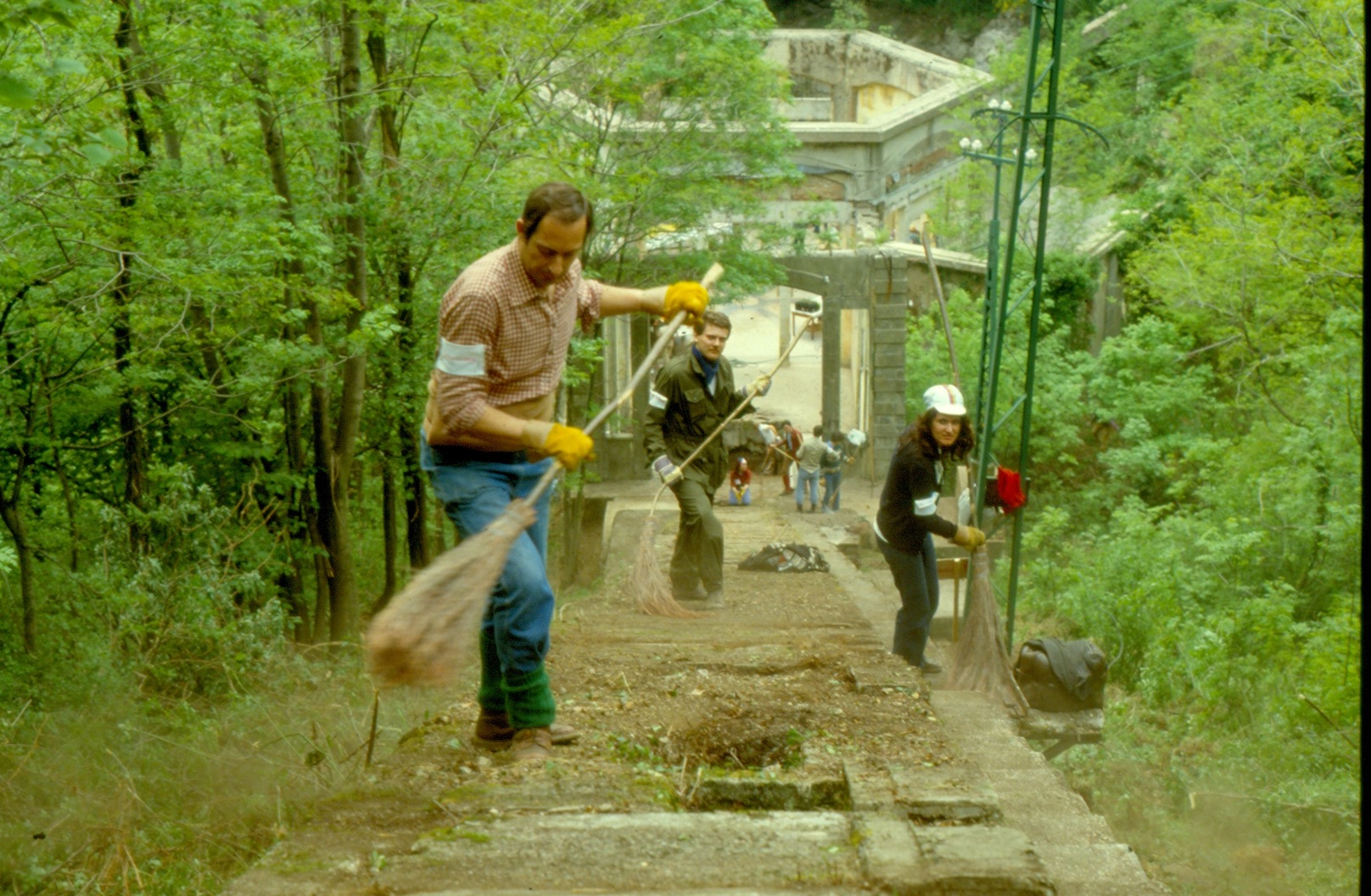La pulizia delle funicolari, sabato 26 maggio 1979, fu una grande impresa promossa dall’Azienda Autonoma di Soggiorno, e mobilito` oltre 500 volontari. L’operazione fu preceduta da quasi un mese di sopralluoghi, riunioni preparatorie, e da lezioni di pronto soccorso e l’organizzazione generale fu affidata a Furia ed alla Schiaparelli.